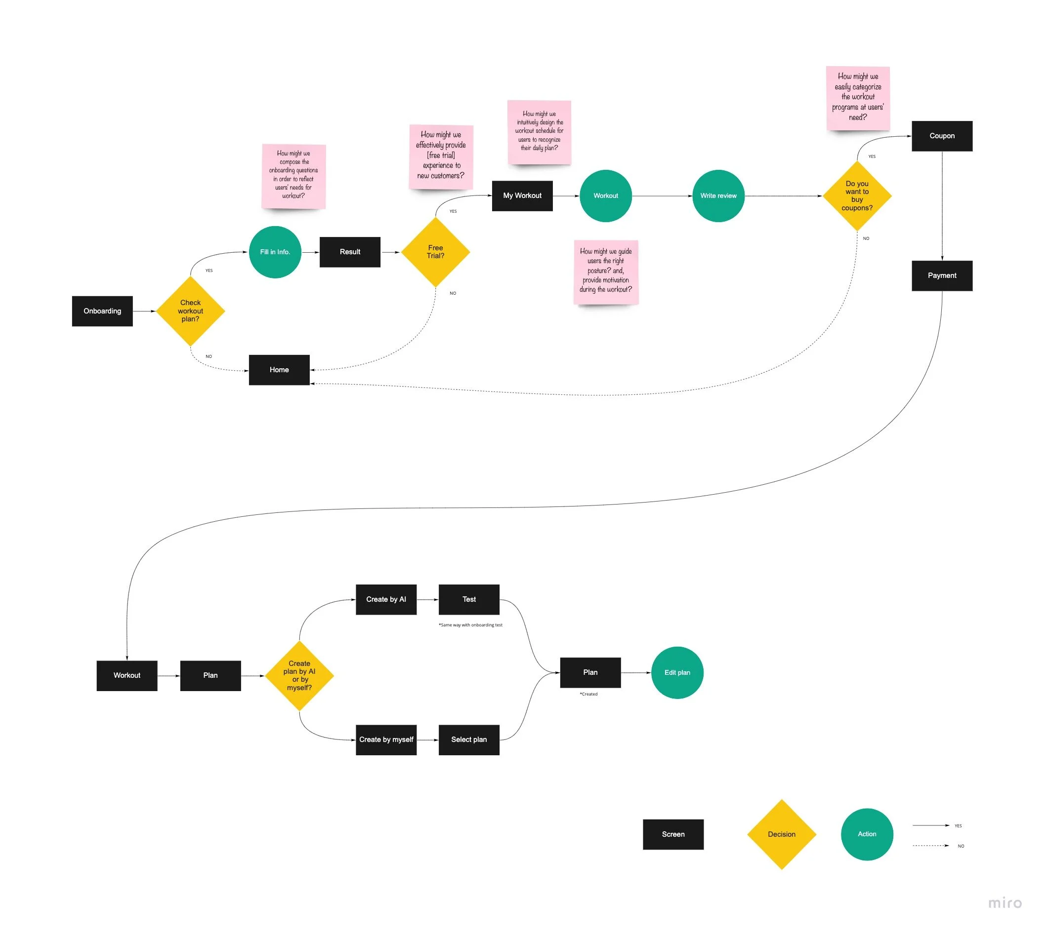 I wanted to understand users’ pain points as much as I could to suggest solutions not only for users, but also for the fitness industry which went through a hard time during Covid-19 pandemic. In addition to formal research process, I worked out at home by myself for 2weeks to understand users and figure out design opportunities to help users maintain a regular workout routine.
