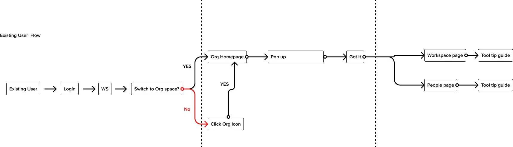 Upon logging in, existing users will be directed to the page they were last on, ensuring a seamless continuation of their workflow. To assist them in accessing the organization space, a tool tip guide with a GIF image will be displayed at the top of the page. By clicking on the organization icon button, users can easily navigate to the organization space. Once there, they will encounter a tutorial popup , providing them with guidance and instructions on how to effectively utilize its features.