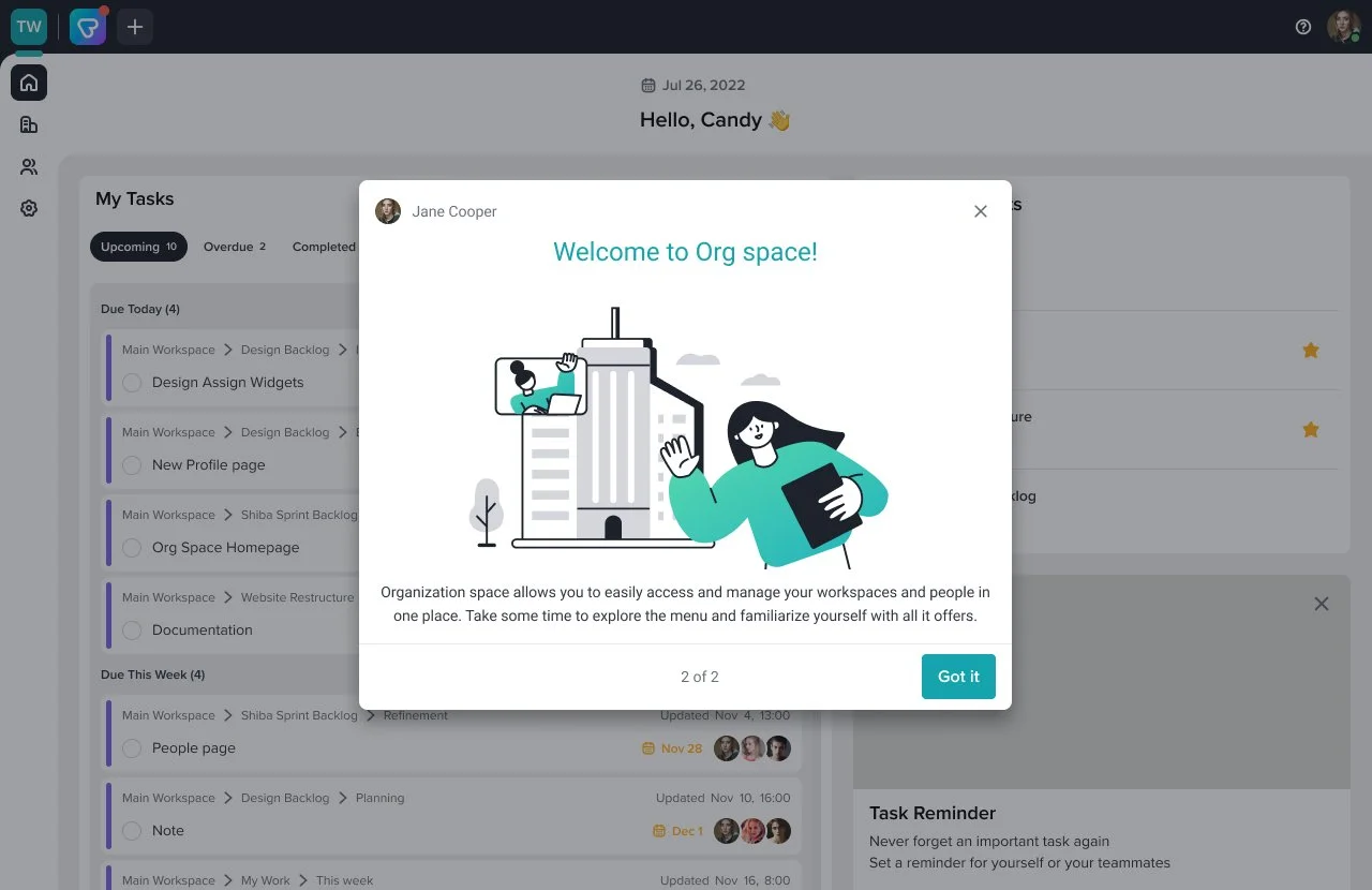 The concept of Org space encompasses a more advanced form of workspaces. Our customers use multiple workspaces to handle a range of projects and people, but encounter challenges when it comes to effectively managing projects and individuals across these workspaces. Org space offers a potential solution for these users, enabling them to efficiently manage people and workspaces without navigating between each workspace.